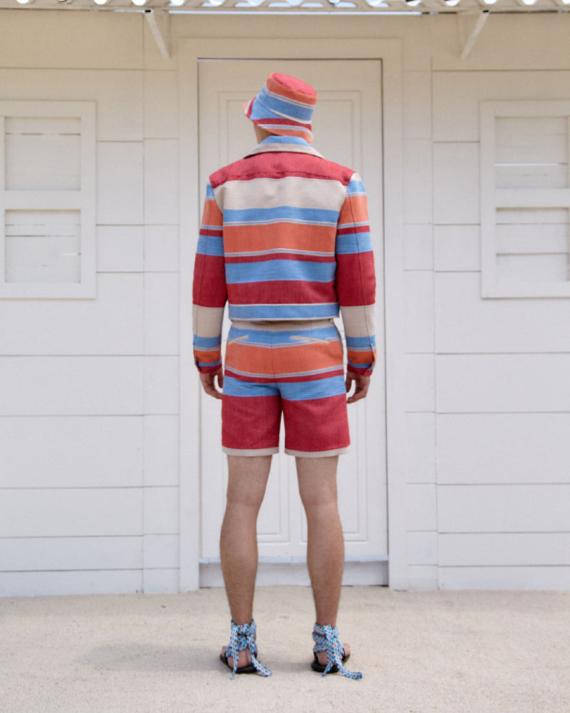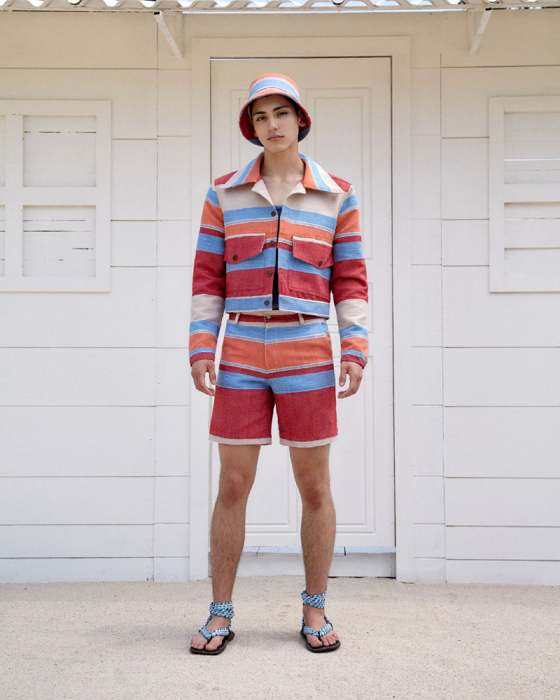 Bermuda hecha en telar a mano por artesanos mexicanos, con estampado de franjas horizontales. Con bolsillos traseros y a los costaods, presillas para cinturón.