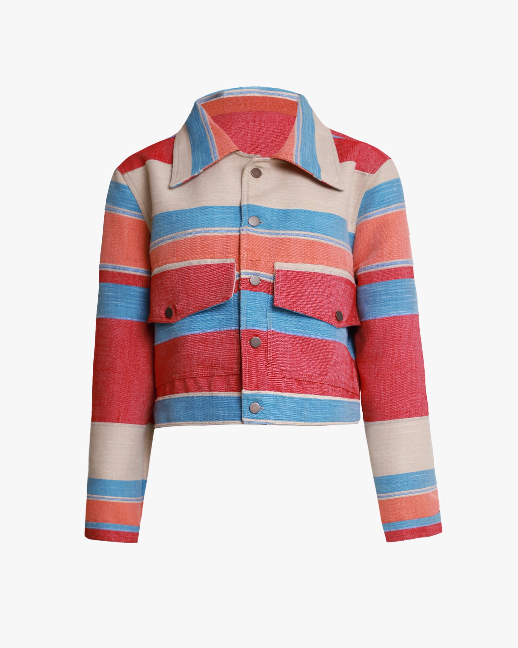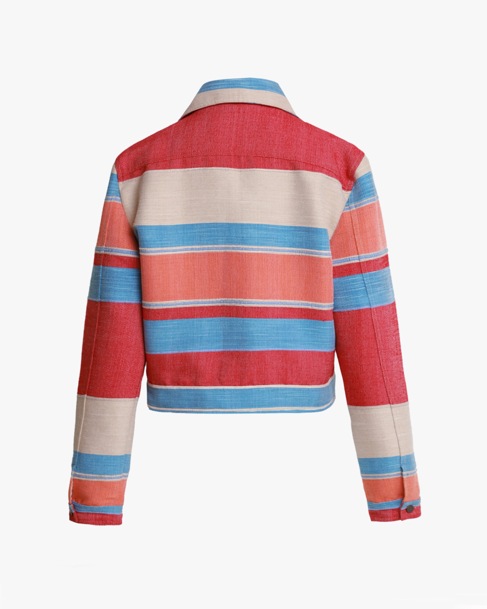 Chamarra con cuello de camisa, botones metálicos y bolsillos frontales con botón; estampado de franjas horizontales.