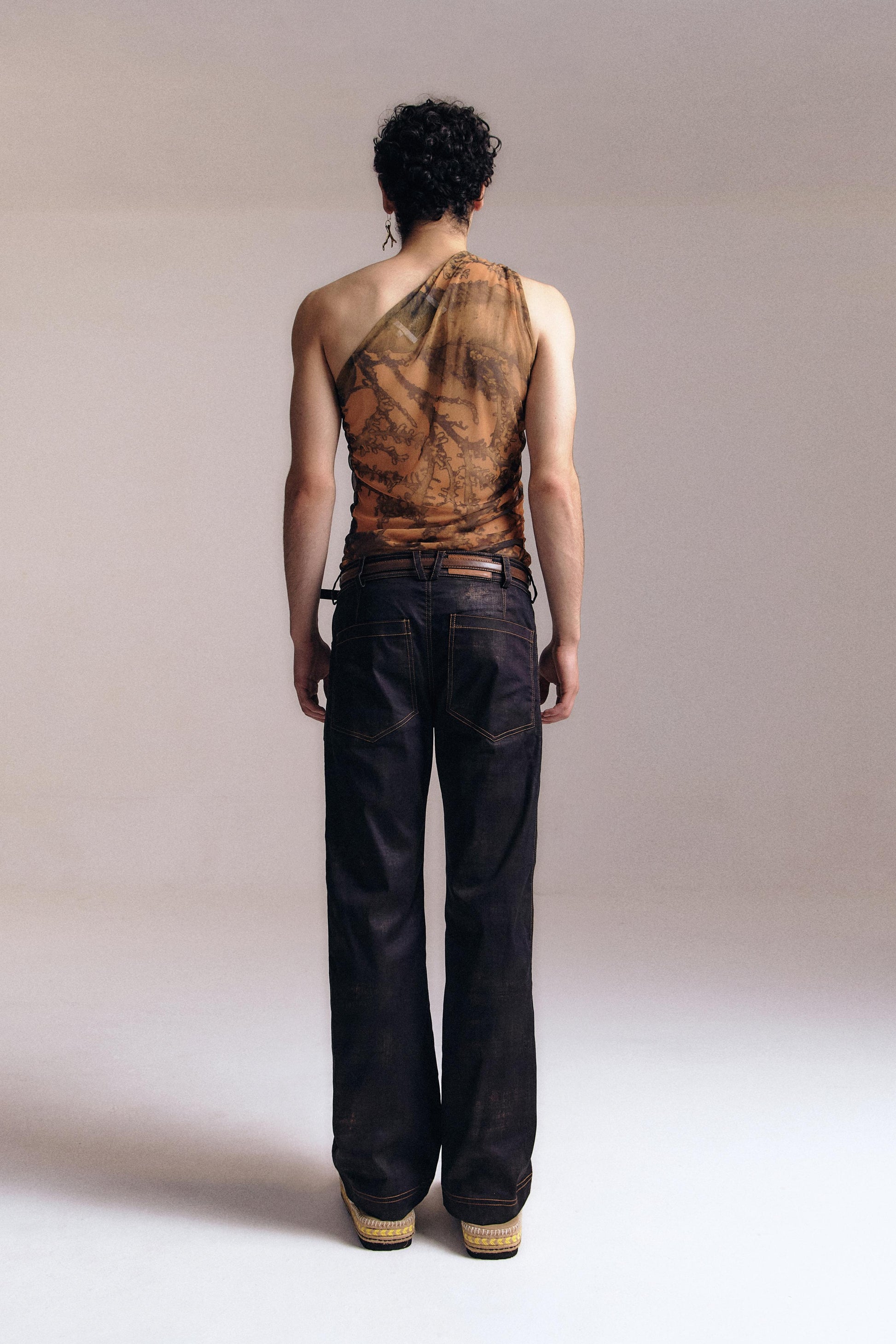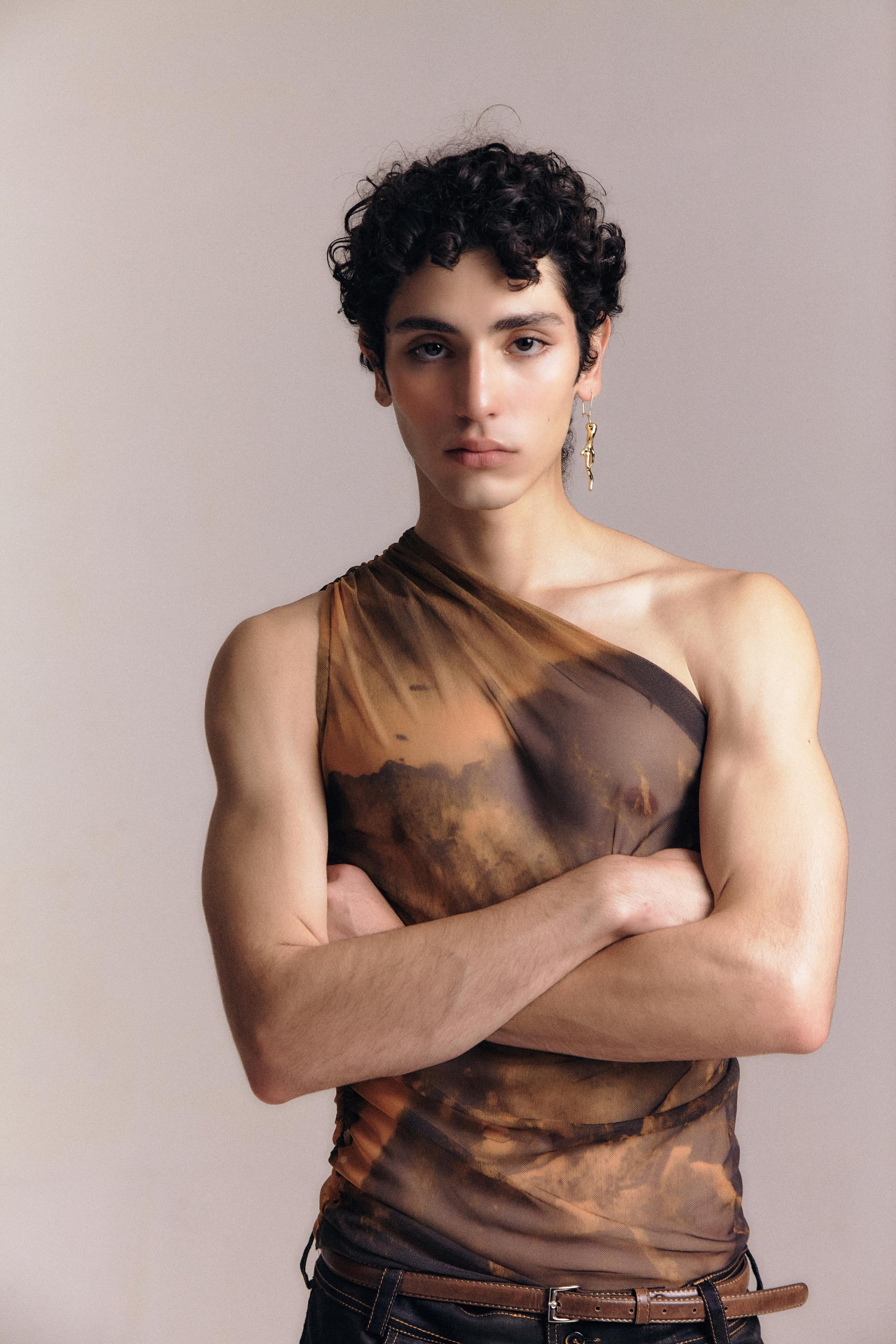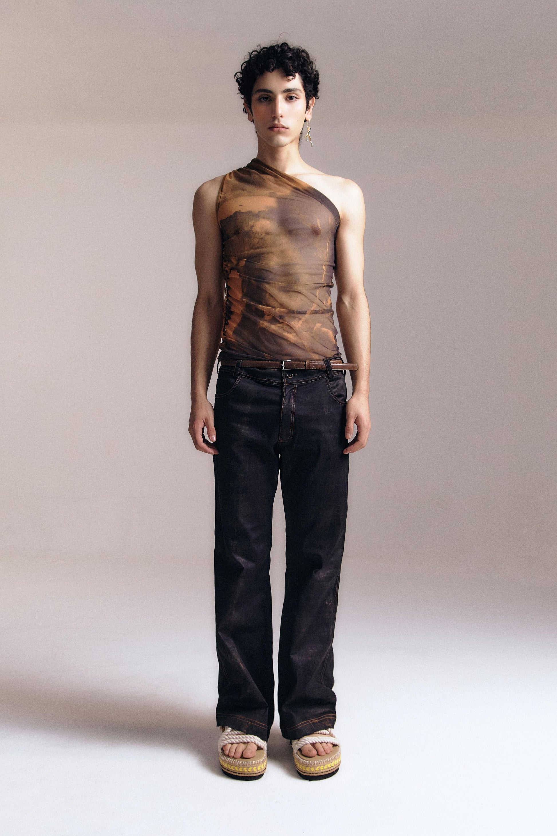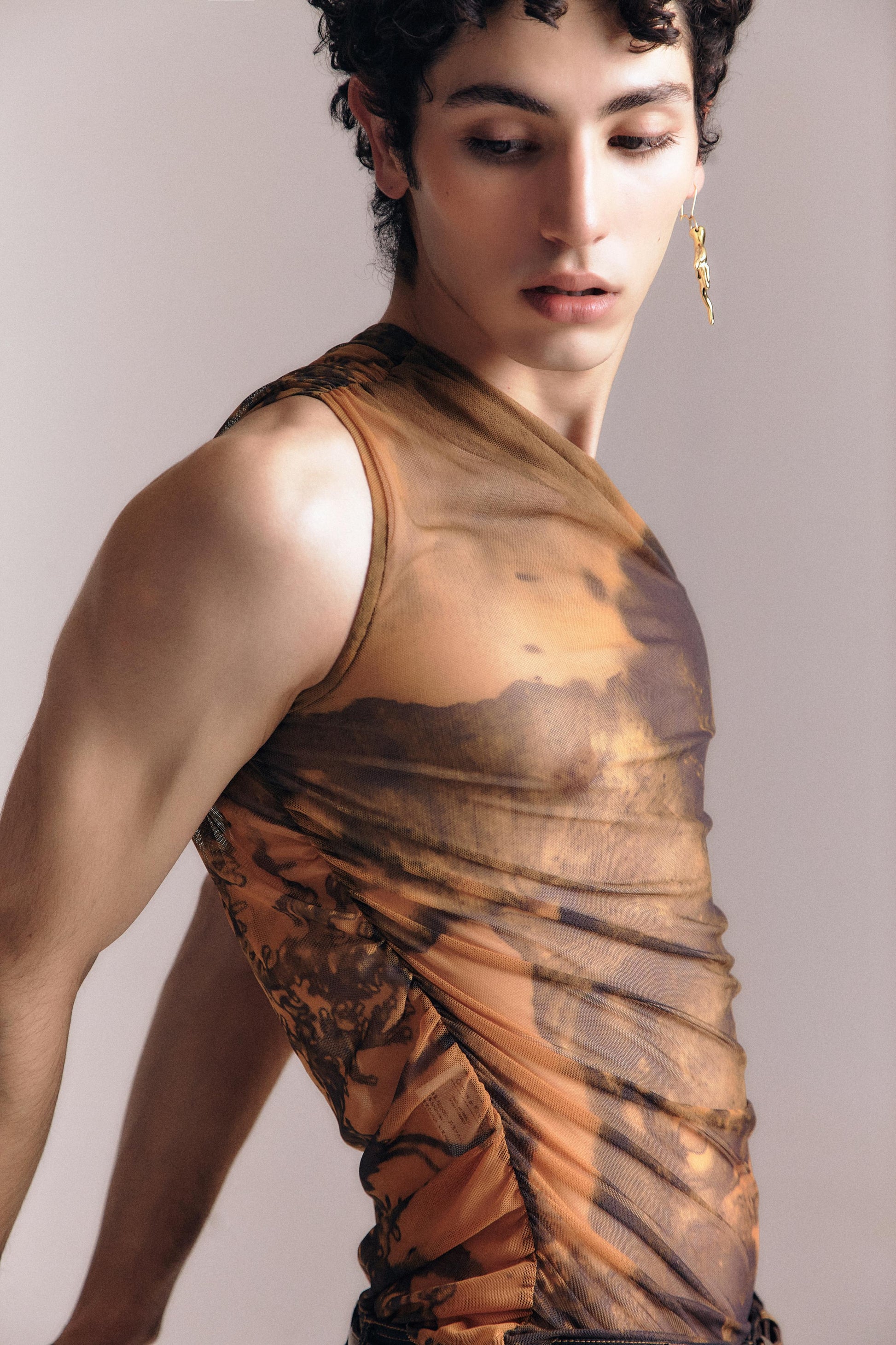 Top de mesh asimétrico estampado, con frunce en el hombro.