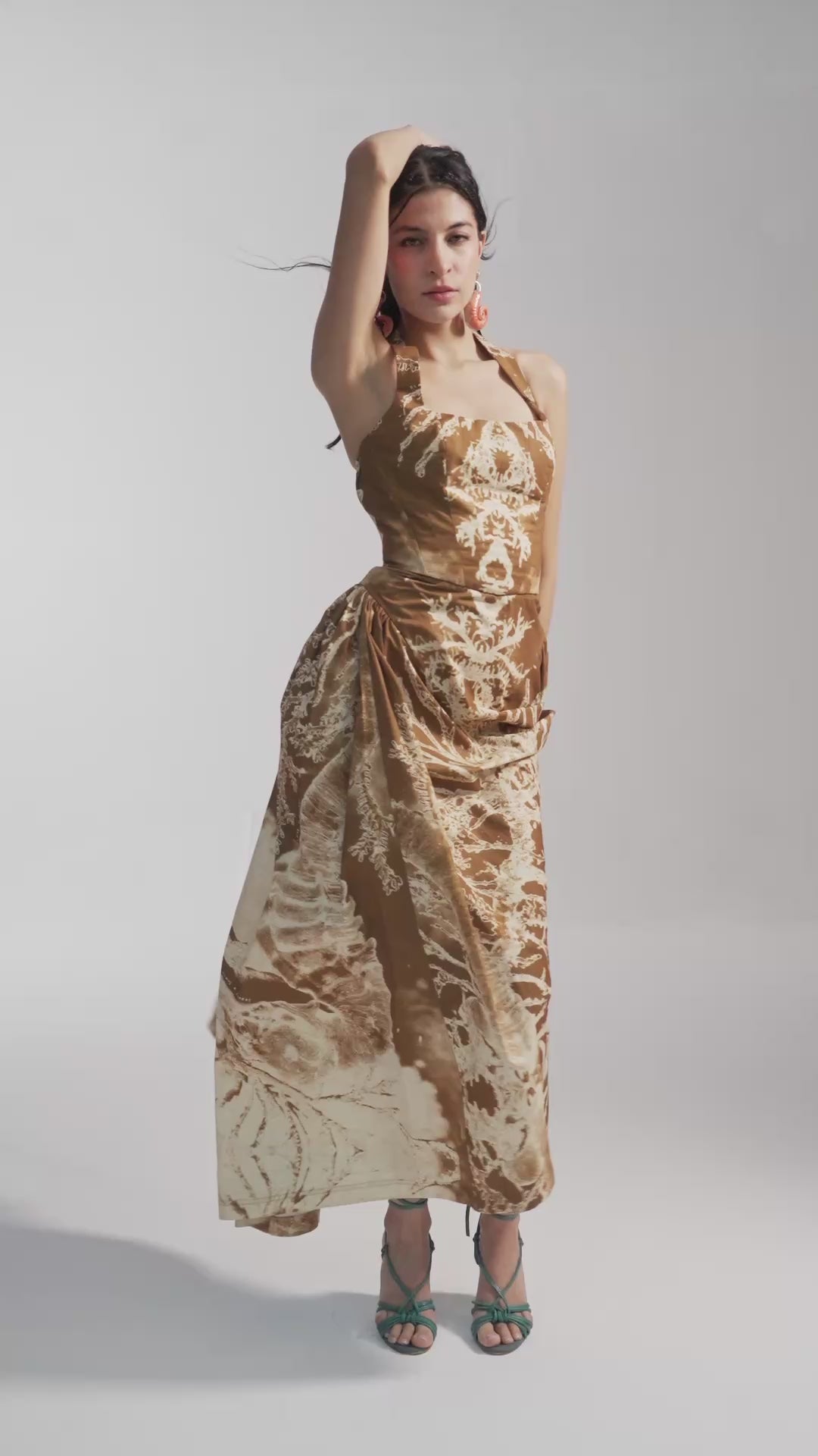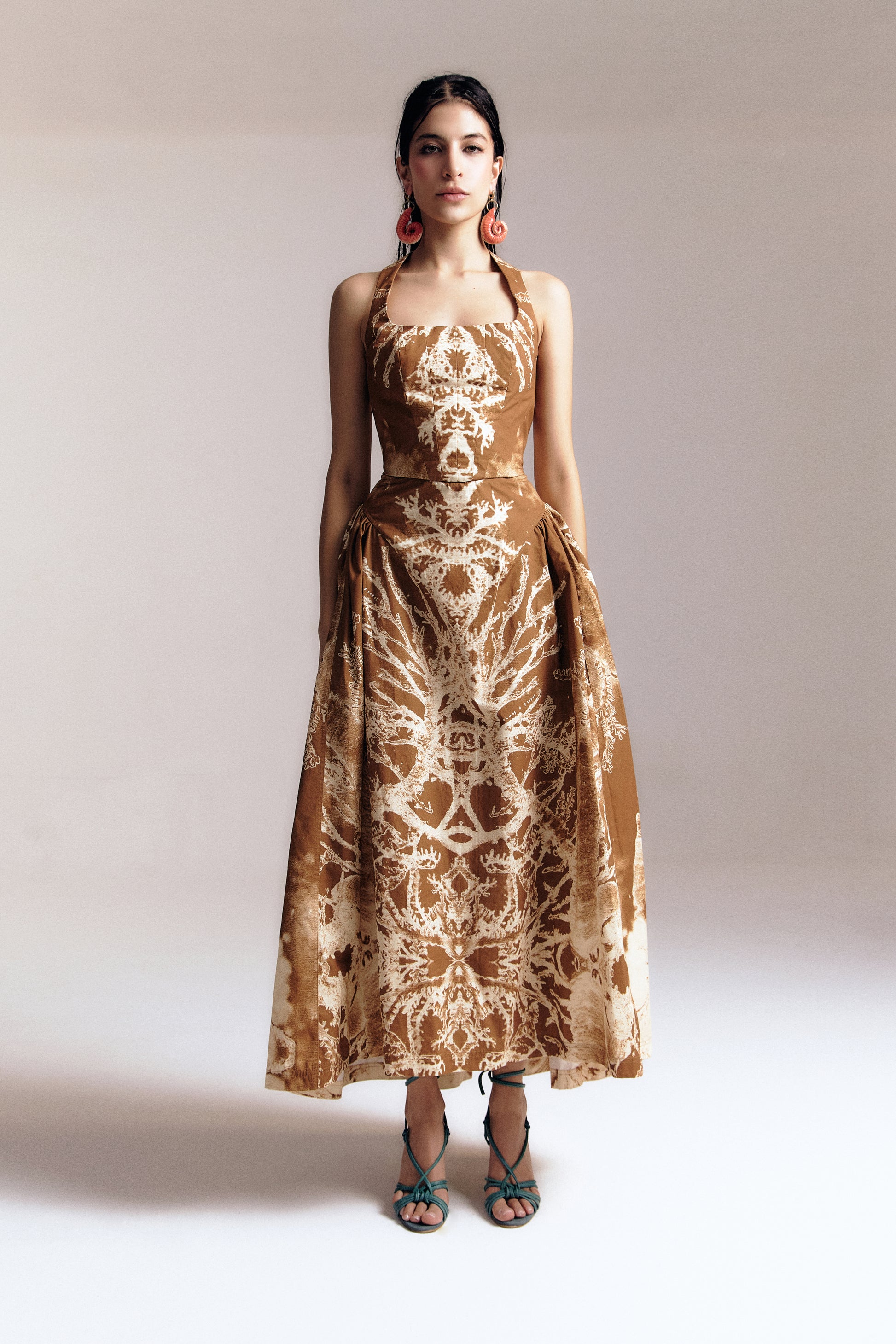 Vestido midi estampado con top tipo corset, escote cuadrado y cuello halter con resorte. Falda amplia con pliegues en laterales. Cierre metálico en la espalda.